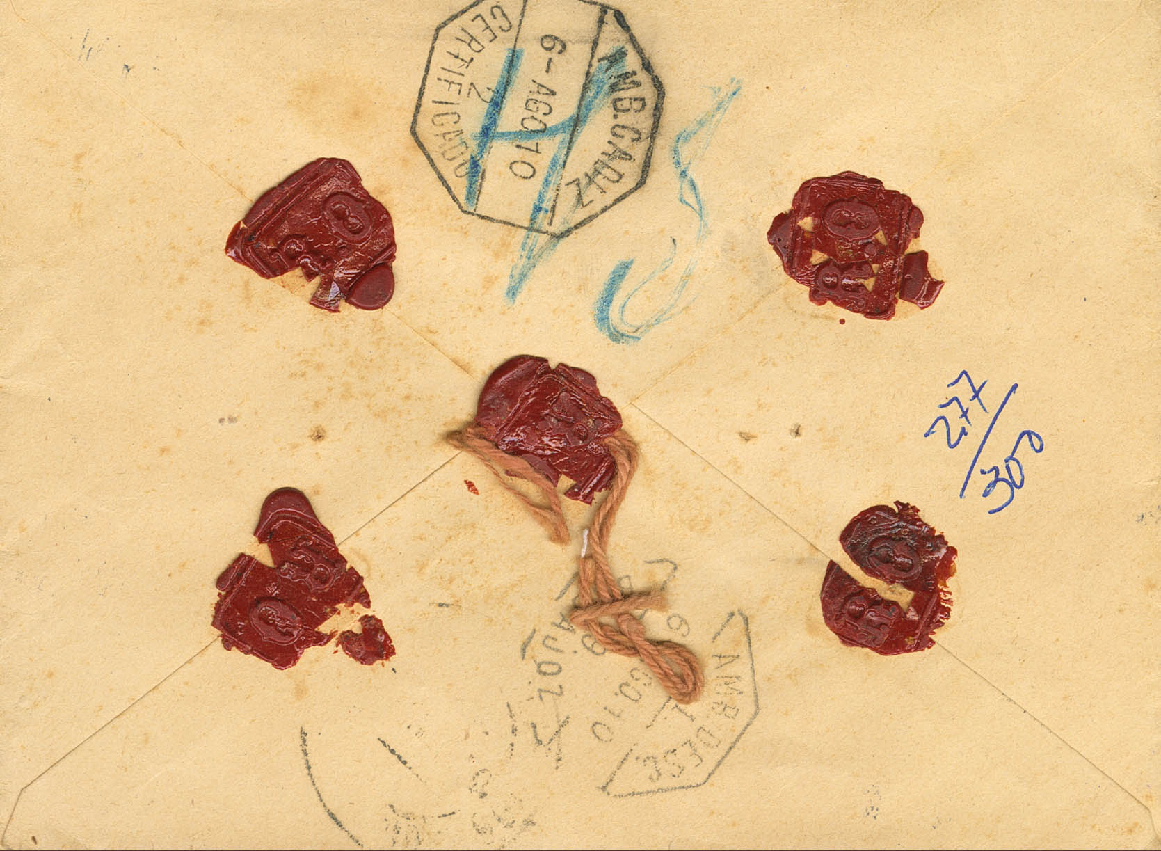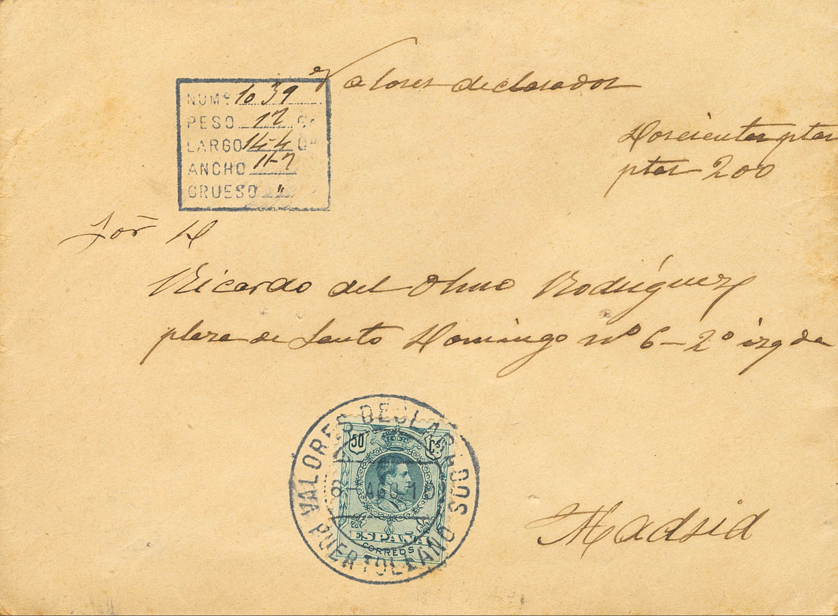 277. 1910. 50 cts verde. Valores Declarados de PUERTOLLANO (CIUDAD-REAL) a MADRID. Matasello VALORES DECLARADOS / PUERTO LLANO, en azul-negro, al dorso ambulantes y llegada. MAGNIFICA.