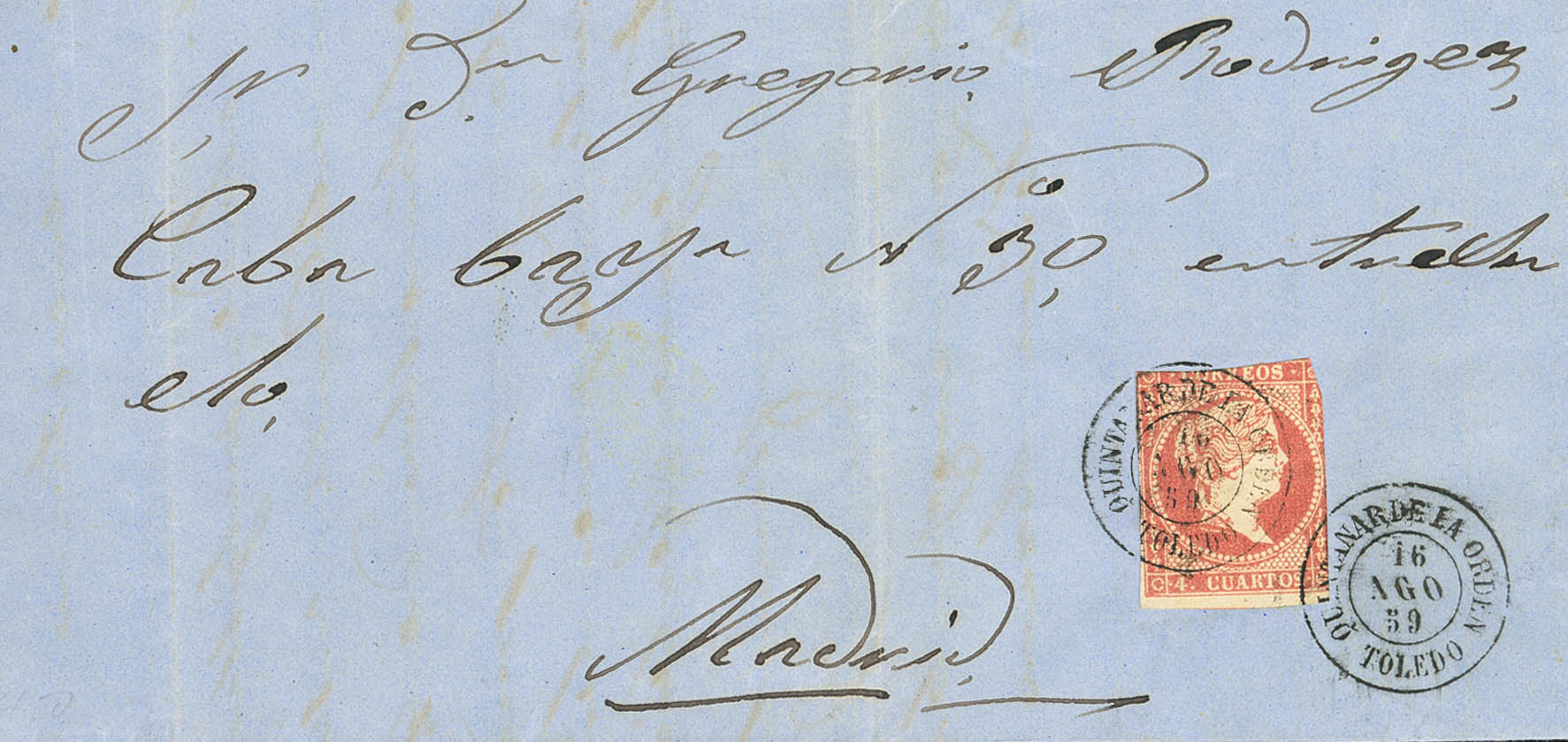 48. 1859. 4 cuartos rojo. QUINTANAR a MADRID. Matasello QUINTANAR DE LA ORDEN / TOLEDO. MAGNIFICA.
