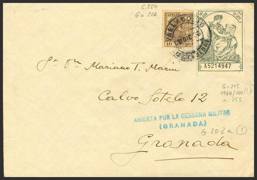 Fis 50, 19. 1936. 10 cts castaño MOVIL y 25 cts verde POLIZA. VALLADOLID a GRANADA. Al dorso llegada. MAGNIFICA.
