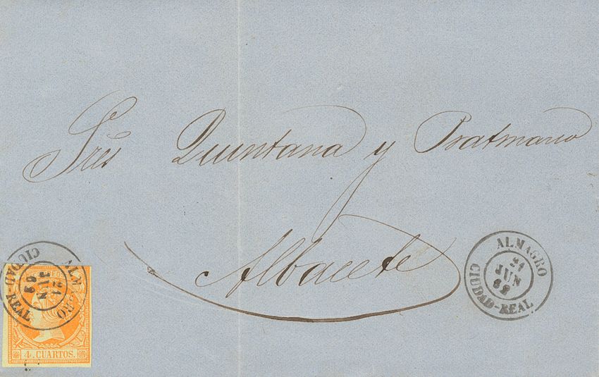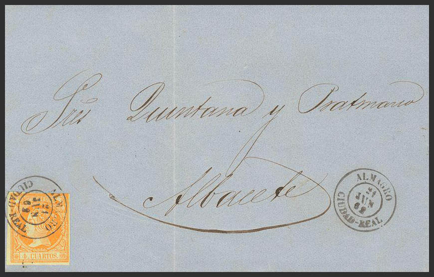 52. 1862. 4 cuartos amarillo. ALMAGRO a ALBACETE. Matasello ALMAGRO / CIUDAD-REAL. MAGNIFICA