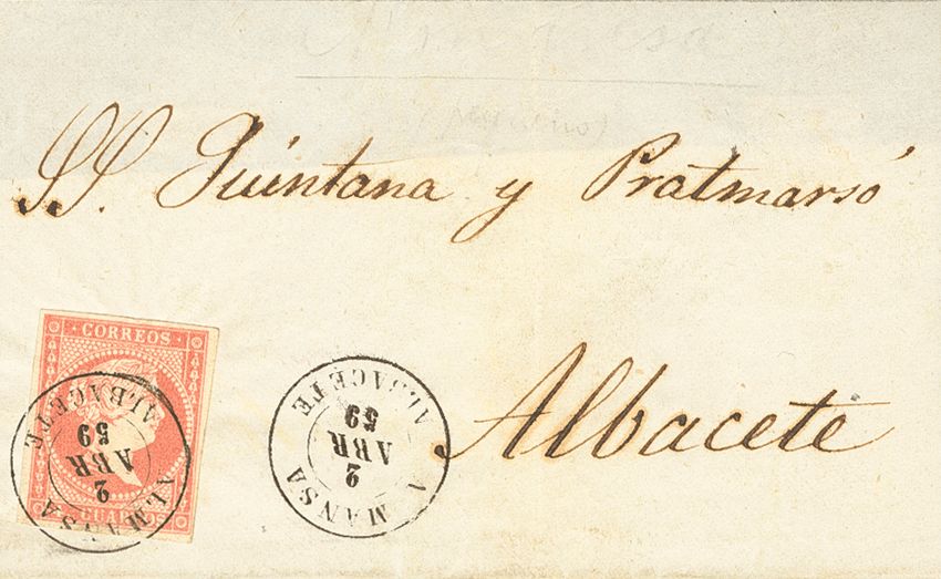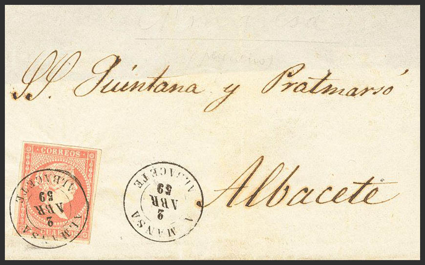 48. 1859. 4 cuartos rojo. ALMANSA a ALBACETE. Matasello ALMANSA / ALBACETE. MAGNIFICA.