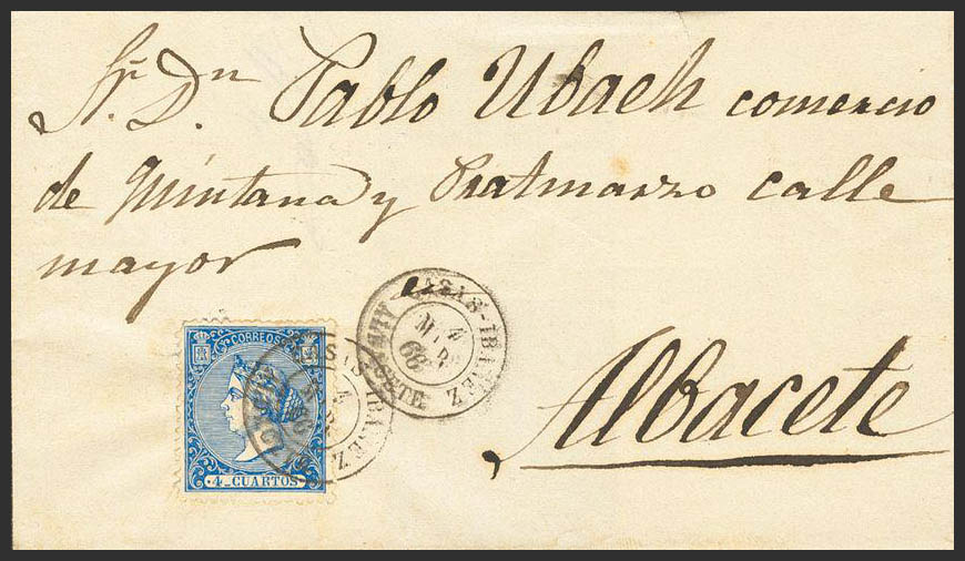 81. 1866. 4 cuartos azul. CASAS-IBAÑEZ a ALBACETE. Matasello CASAS-IBAÑEZ / ALBACETE. MAGNIFICA.