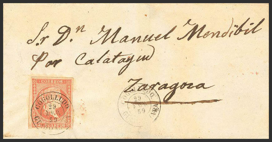 48. 1859. 4 cuartos rojo. COGOLLUDO a ZARAGOZA. Matasello COGOLLUDO / GUADALAJARA. MAGNIFICA Y RARA.