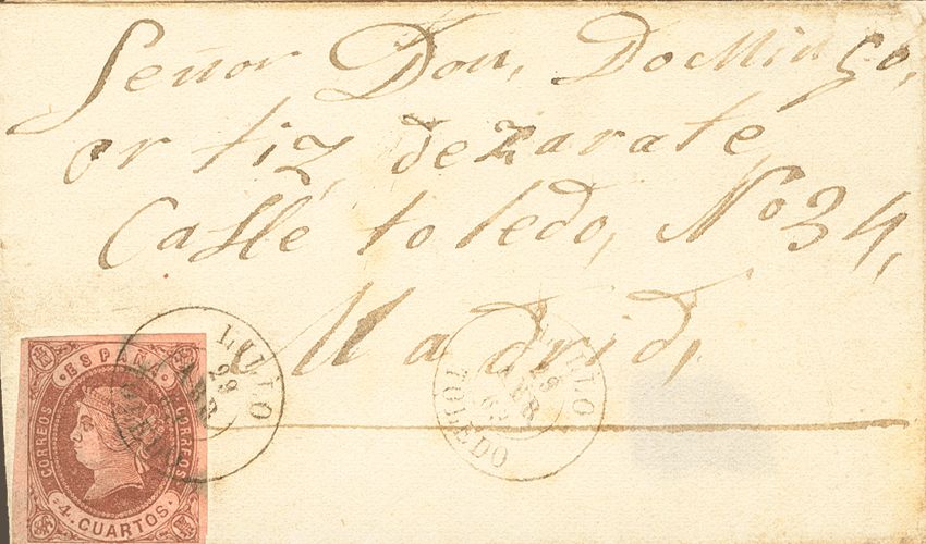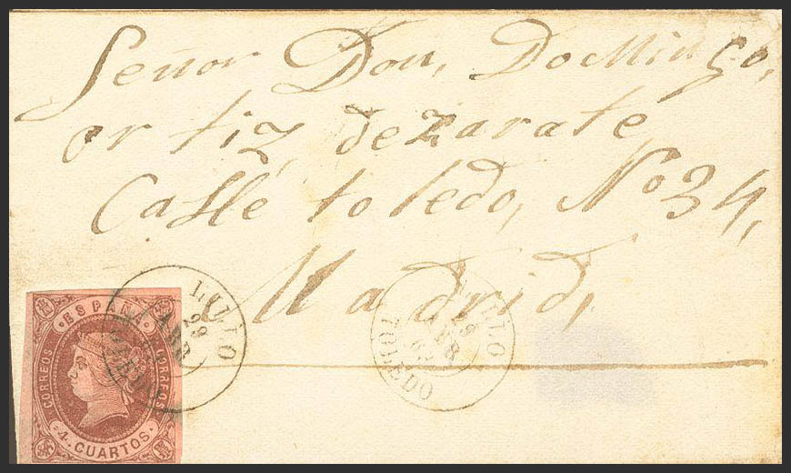 58. 1863. 4 cuartos castaño. LILLO a MADRID. Matasello LILLO / TOLEDO. MAGNIFICA Y MUY RARA.