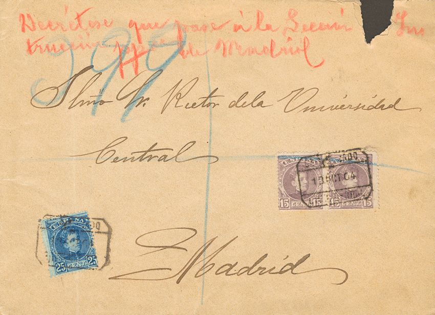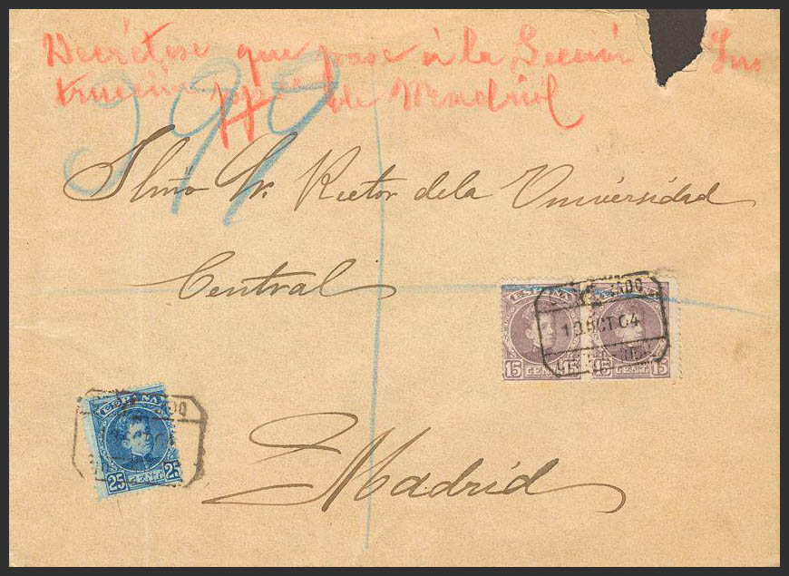 246(2), 248. 1904. 15 cts violeta, pareja y 25 cts azul. Certificado de CIUDAD REAL a MADRID. Pequeña erosión sin importancia. MAGNIFICO.