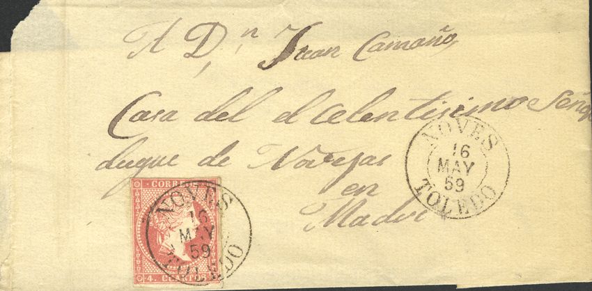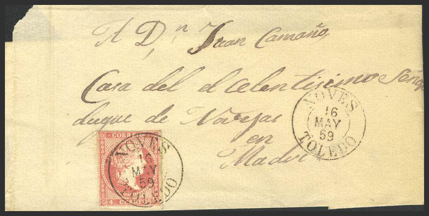 48. 1859. 4 cuartos rojo. NOVES a MADRID. Matasello NOVES / TOLEDO (Tipo I). MAGNIFICA.