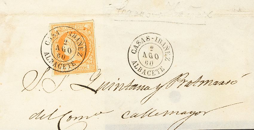 △ 52. 1860. 4 cuartos naranja, sobre gran fragmento. Matasello CASAS-IBAÑEZ / ALBACETE. MAGNIFICO.