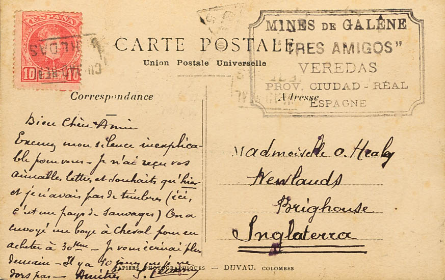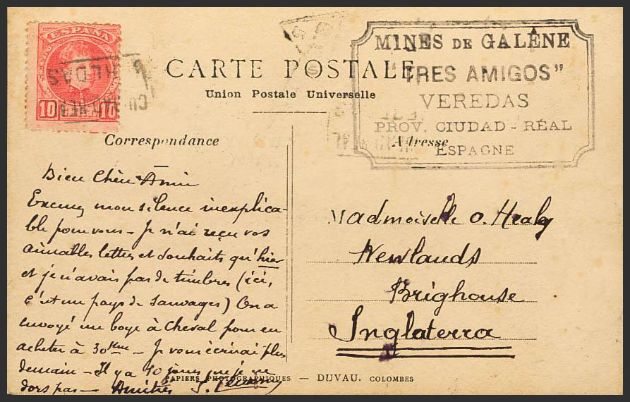 243. (1900ca). 10 cts rojo. VEREDAS a BRIGHOUSE (INGLATERRA). Matasello carterÃa VEREDAS / CIUDAD-REAL. MAGNIFICA.