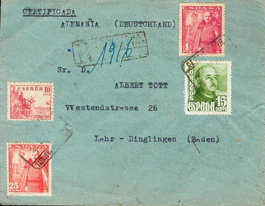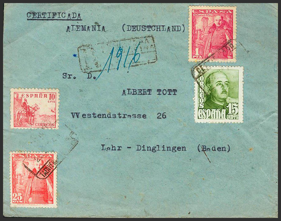 917, 1021, 1024, 1032. 1949. 10 cts, 15 cts verde, 25 cts rojo y 1 pts rosa. Certificado de TALAVERA DE LA REINA a LAHR (ALEMANIA). Al dorso llegada. MAGNIFICA.