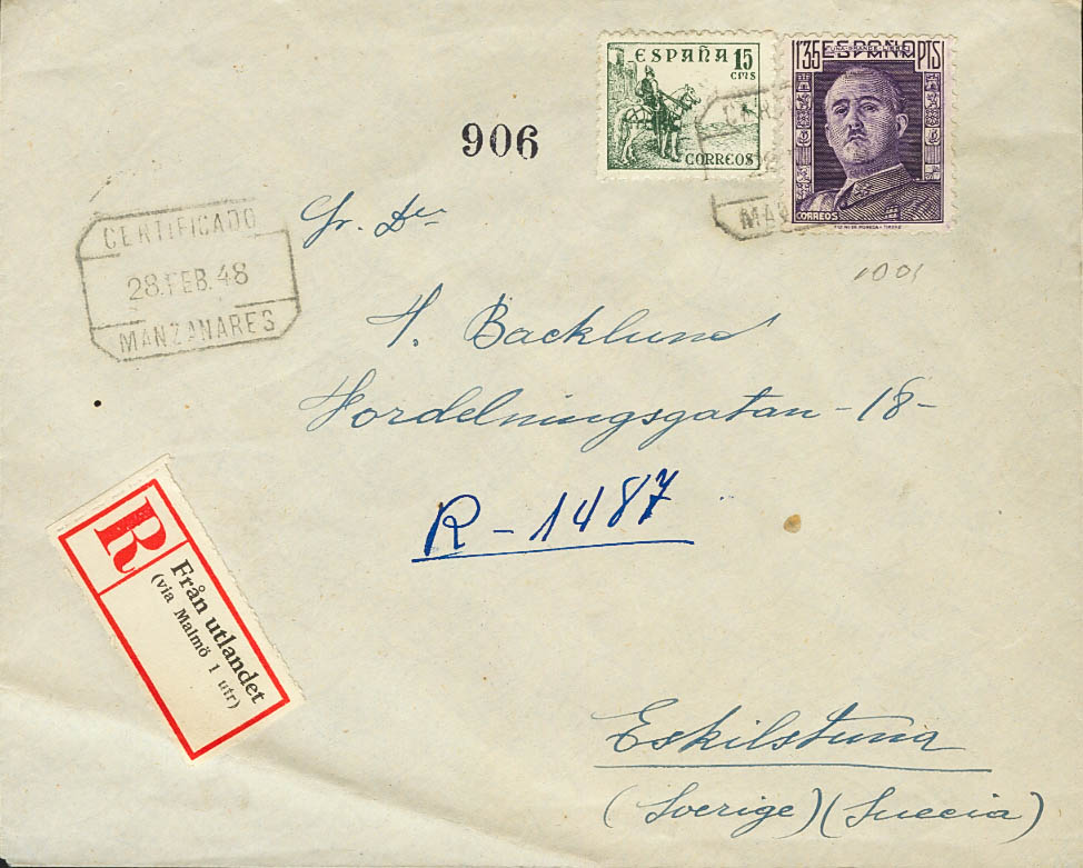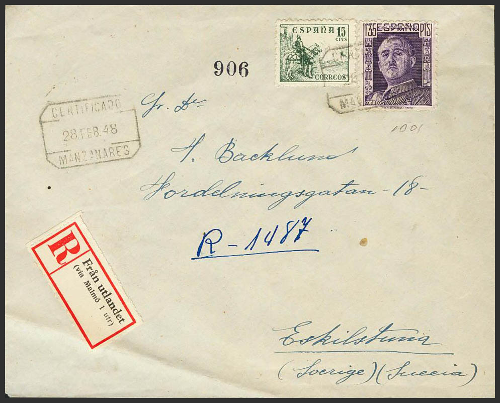 Castilla-La Mancha. Historia Postal. CERTIFICADO / MANZANARES. MAGNIFICA.