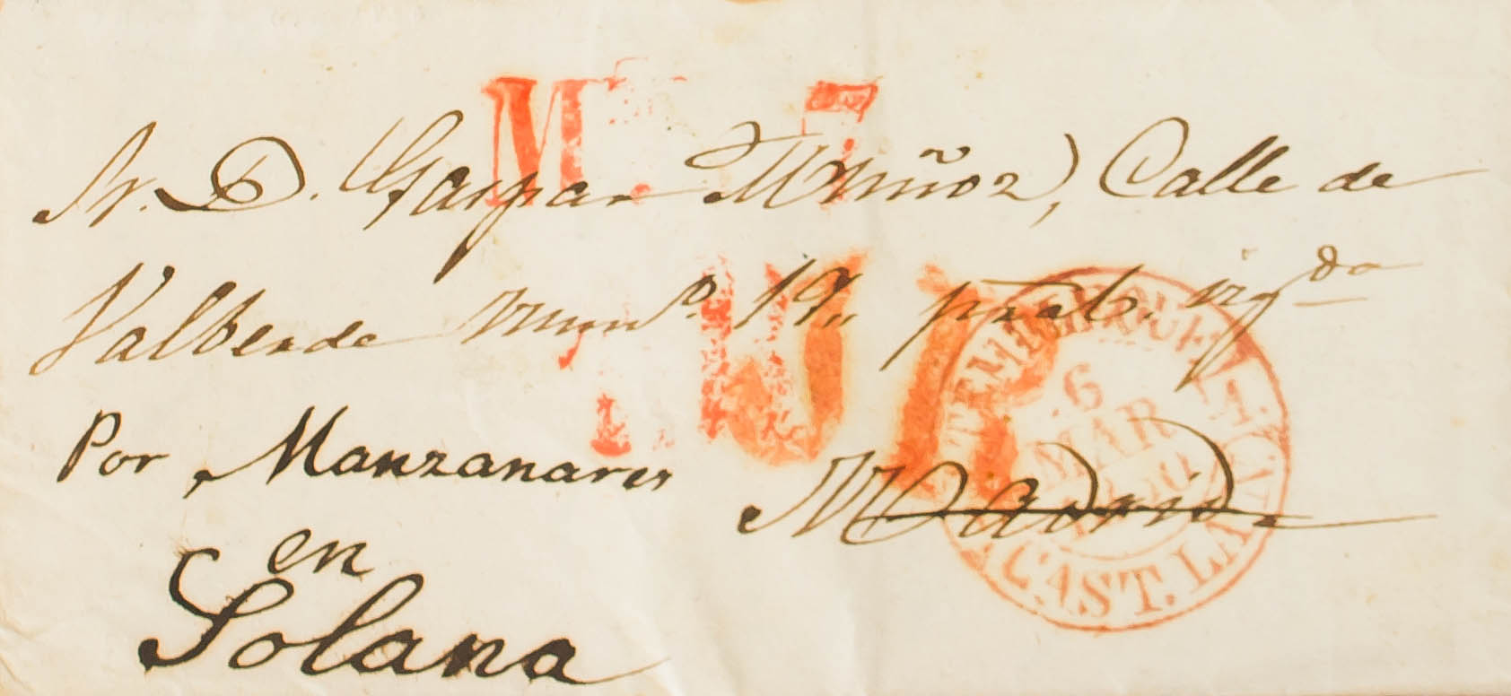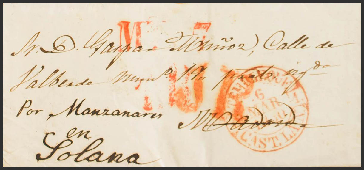 1850. VILLACAÑAS a SOLANA. Baeza TEMBLEQUE / CAST. LA N., en rojo. MAGNIFICA Y RARA.