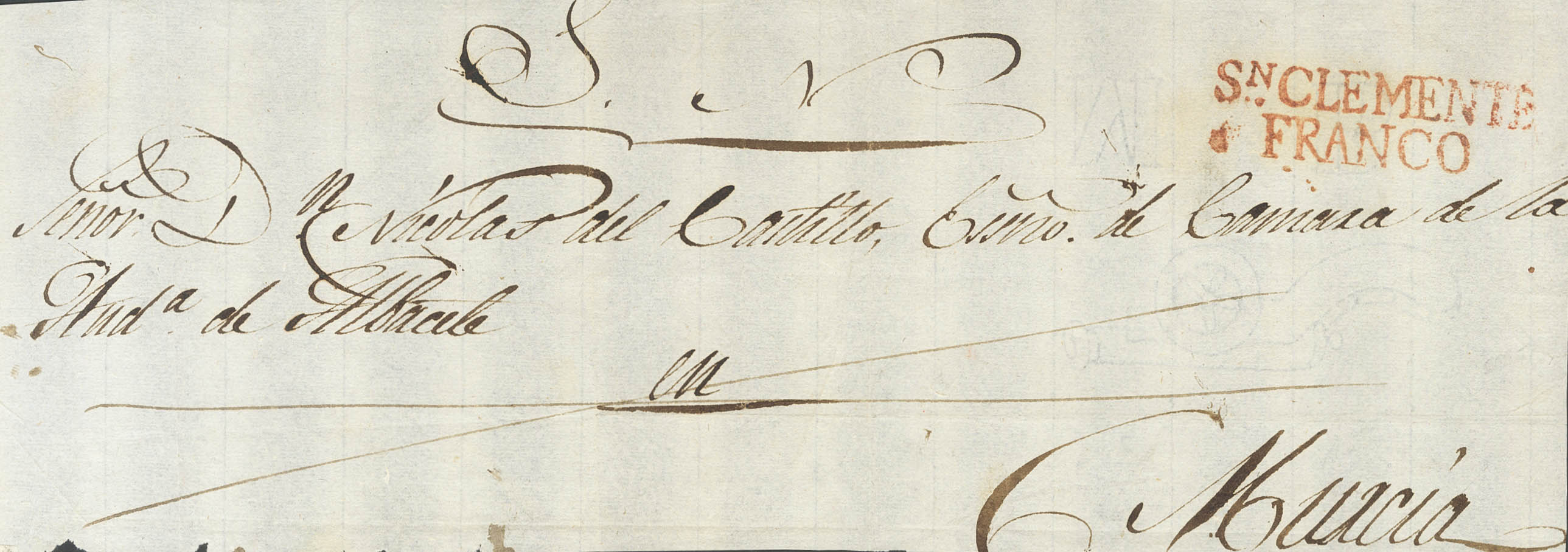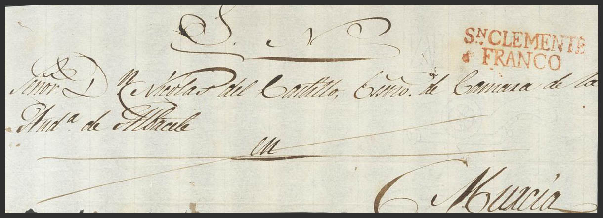 (1830ca). Frente de Plica Judicial de SAN CLEMENTE (CUENCA) a MURCIA. Marca SN. CLEMENTE / FRANCO (P.E.9) edición 2004 (se adjunta un recorte original de la misma marca). MAGNIFICA Y EXTRAORDINARIAMENTE RARA, PROBABLEMENTE SE TRATE DE LA UNICA CONOCIDA Y LA QUE A SU VEZ REFERENCIA EL PROPIO TIZON EN SU MAGNA OBRA.