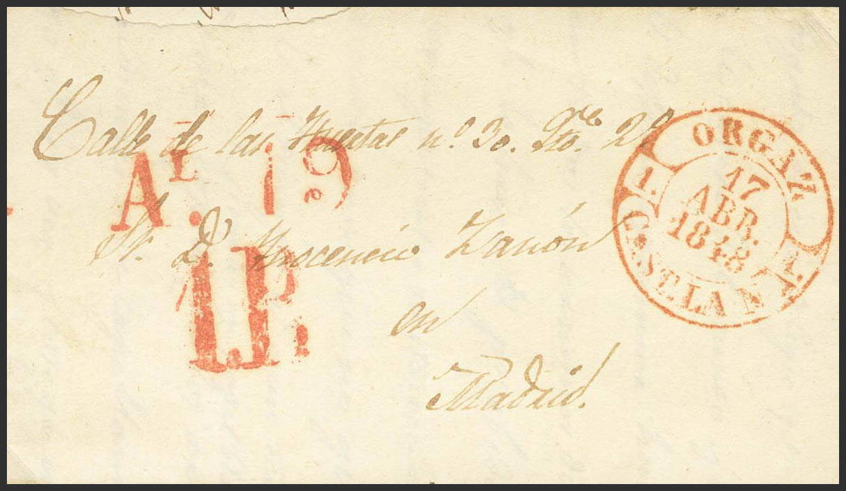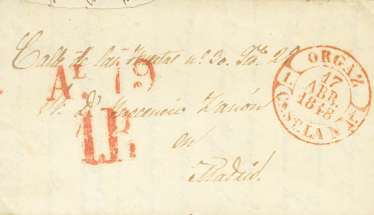 1848. ORGAZ a MADRID. Baeza ORGAZ / CAST. LA N., en rojo. MAGNIFICA ESTAMPACION.