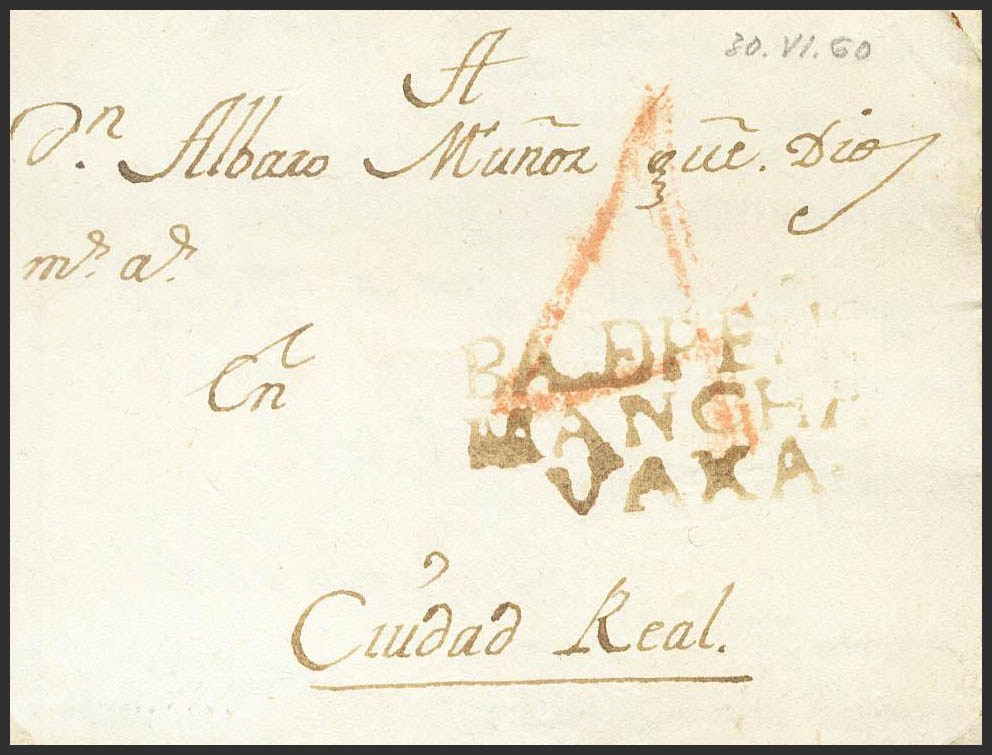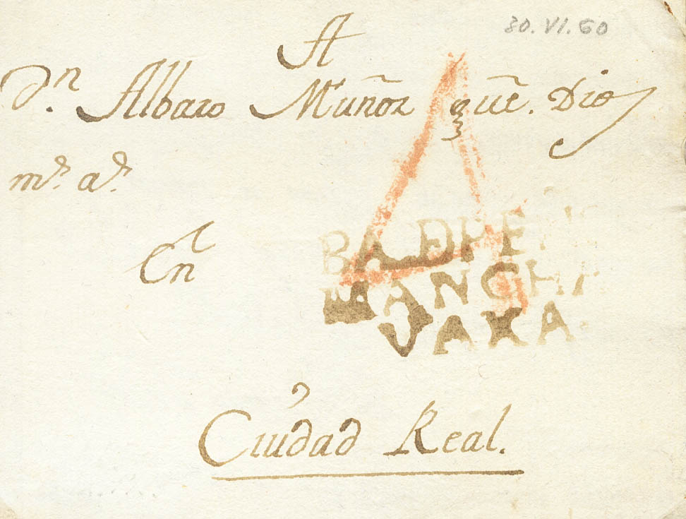 1799. VALDEPEÑAS a CIUDAD REAL. Marca BALDEPEÑS / MANCHA / VAXA, en tinta de escribir (P.E.1) edición 2004. MAGNIFICA Y MUY RARA.
