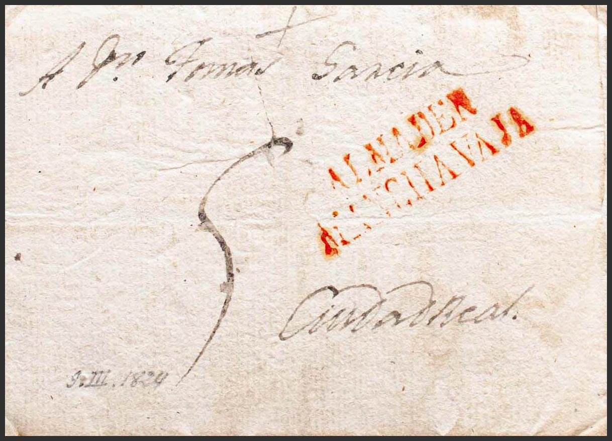Castilla-La Mancha. Prefilatelia. 1824. ALMADEN / MANCHA VAJA, en rojo (P.E.3) edición 2004. MAGNIFICA.
