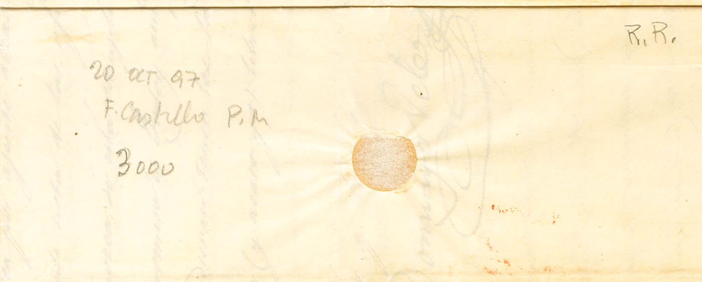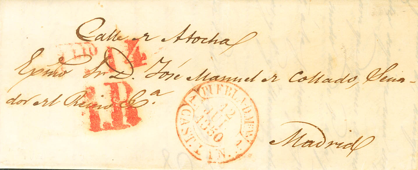 1850. PUEBLA DE MONTALBAN (TOLEDO) a MADRID. Baeza PUEBLA D.MBAN / CAST.LA N, en rojo. MAGNIFICA Y MUY RARA.