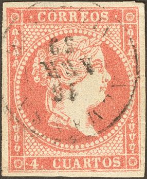 48. 1856. 4 cuartos rojo. Matasello ALMANSA / ALBACETE. POCO LEGIBLE.