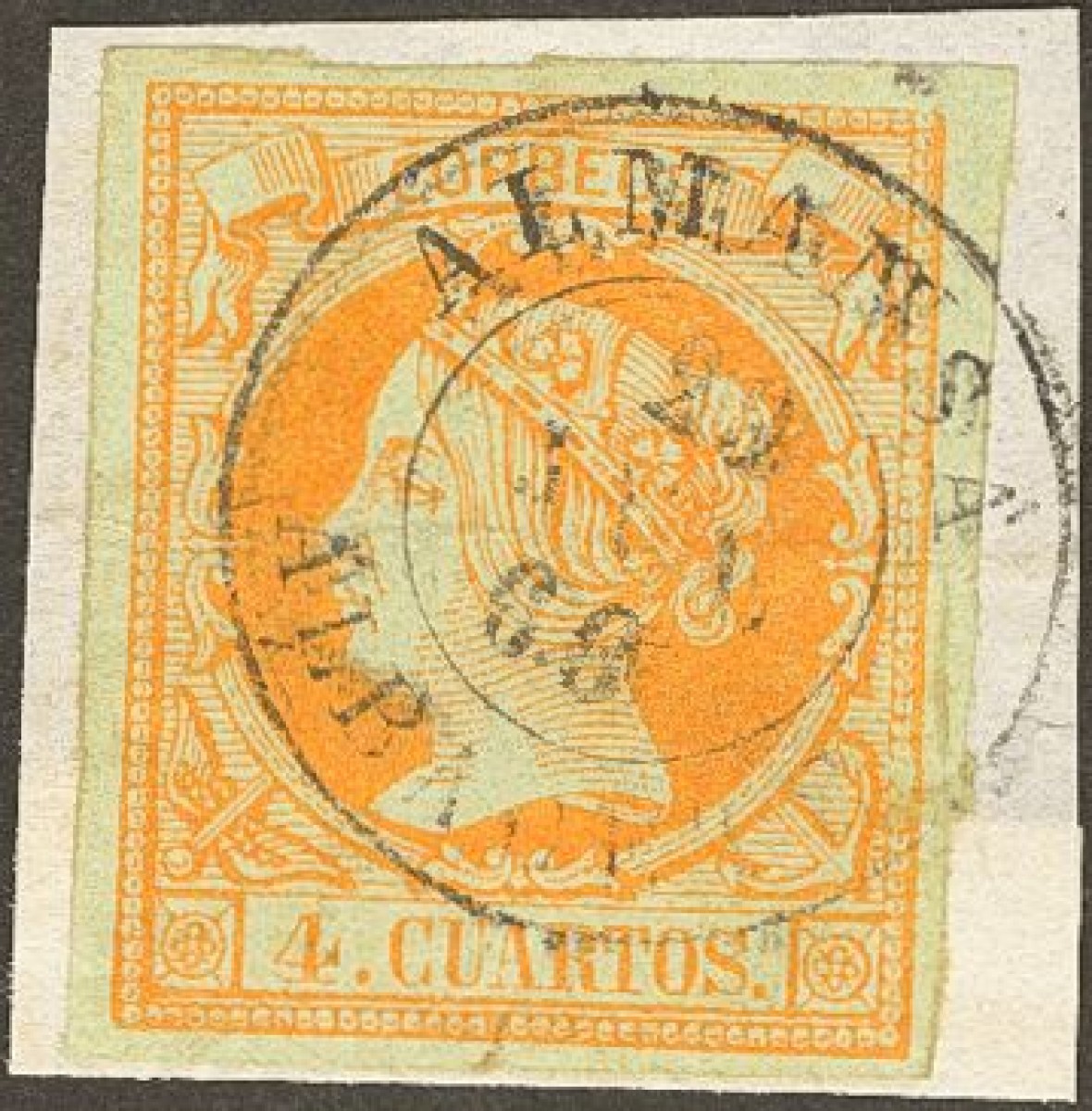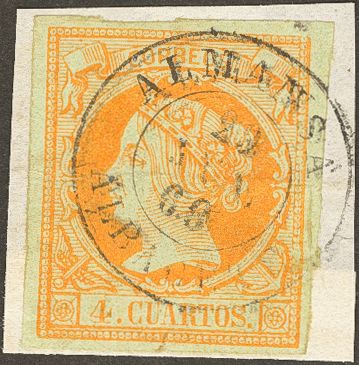 52. 1860. 4 cuartos amarillo. Matasello ALMANSA / ALBACETE. MAGNIFICO.