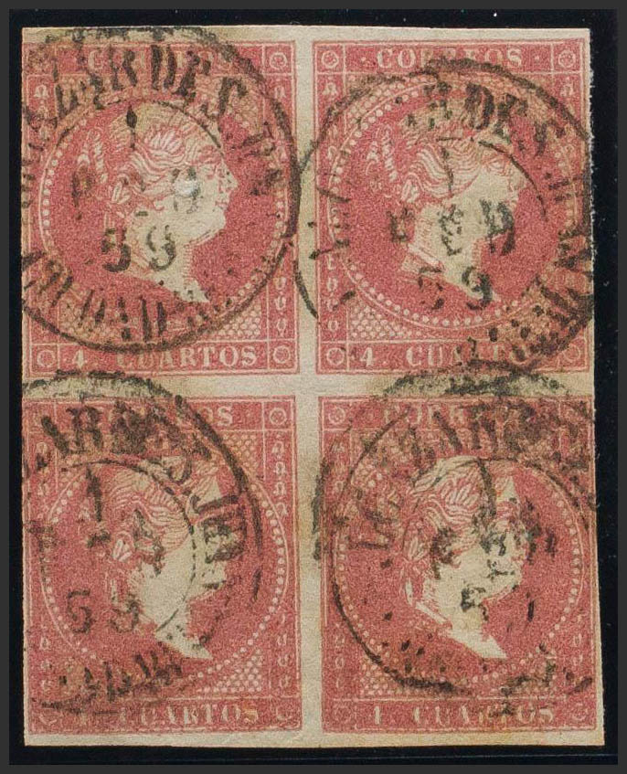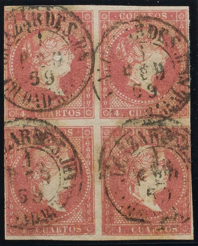 48(4). 1856. 4 cuartos rojo, bloque de cuatro. Matasello ALCAZAR DE S. JUAN / CIUDAD REAL (Tipo I). BONITO Y MUY RARO.