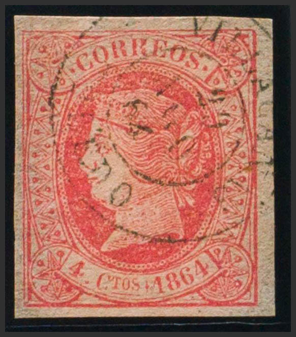 64. 1864. 4 cuartos rojo. Matasello VILLACAÑAS / TOLEDO. MAGNIFICO Y MUY RARO.