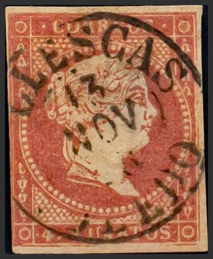 48. 1856. 4 cuartos rojo. Matasello ILLESCAS / TOLEDO (Tipo I). MAGNIFICO Y RARO.