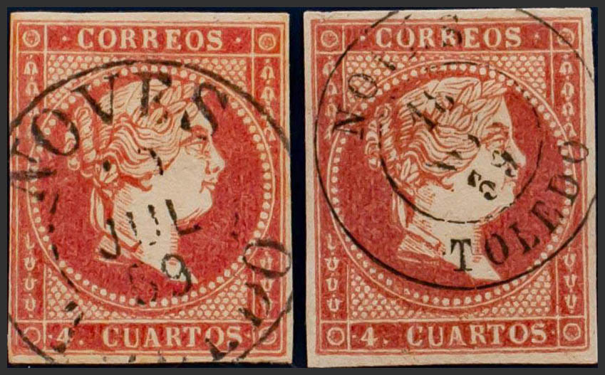 48(2). 1859. Conjunto de dos sellos del 4 cuartos rojo inutilizados con el matasello NOVES / TOLEDO (Tipo I y II, respectivamente). MAGNIFICOS.