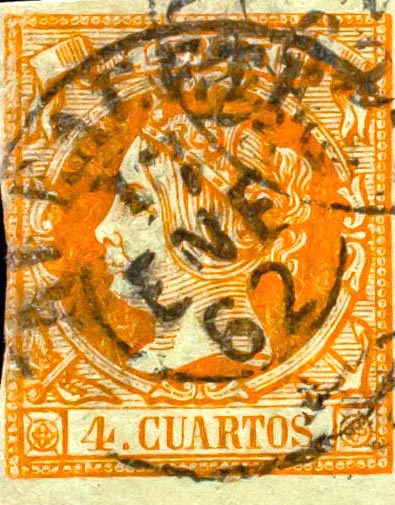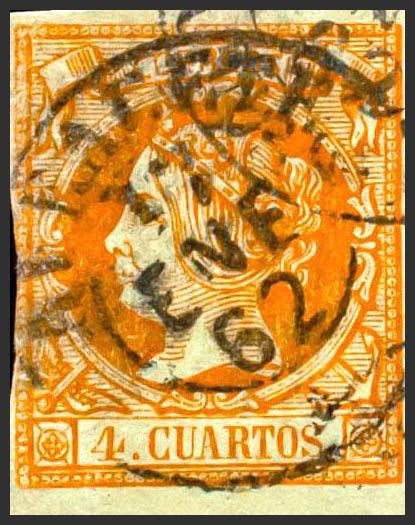 52. 1860. 4 cuartos amarillo. Matasello ALBACETE / * (Tipo I). BONITO Y MUY RARO.