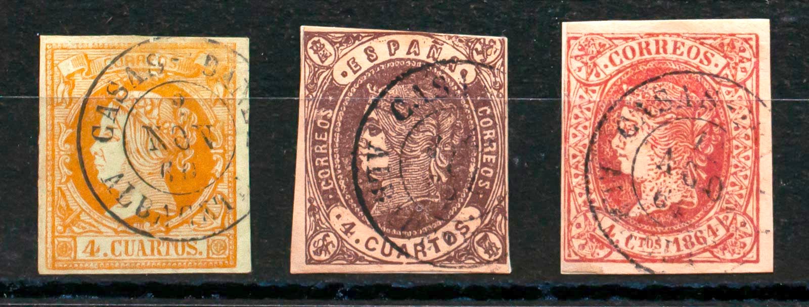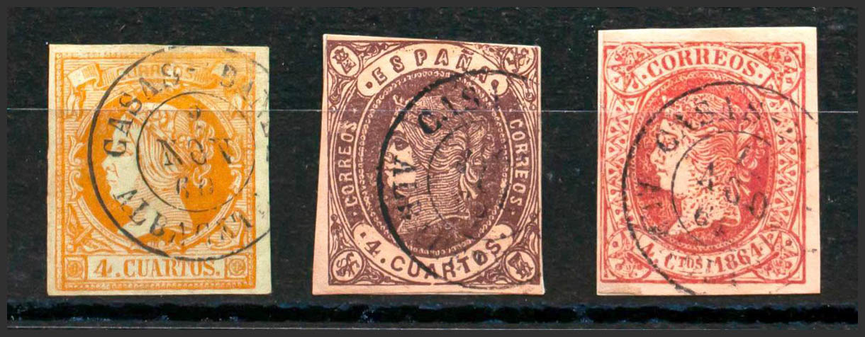 52, 58, 64. (1860ca). Conjunto de tres sellos del 4 cuartos amarillo castaño y rosa, inutilizados con el matasello CASAS-IBAÑEZ / ALBACETE. MAGNIFICO.