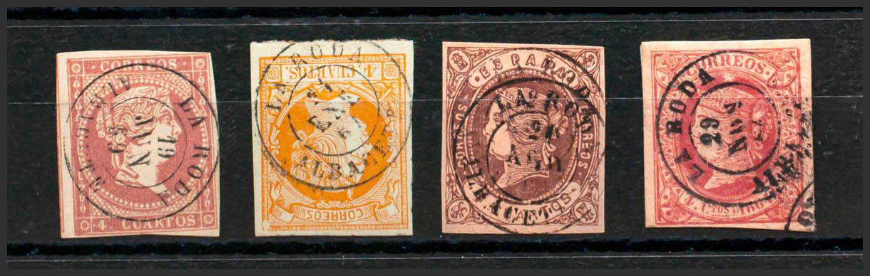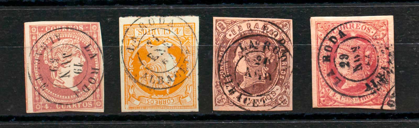 48, 52, 58, 64. (1855ca). Conjunto de cuatro sellos del 4 cuartos rojo, amarillo, castaño y rosa, inutilizados con el matasello LA RODA / ALBACETE. MAGNIFICO.