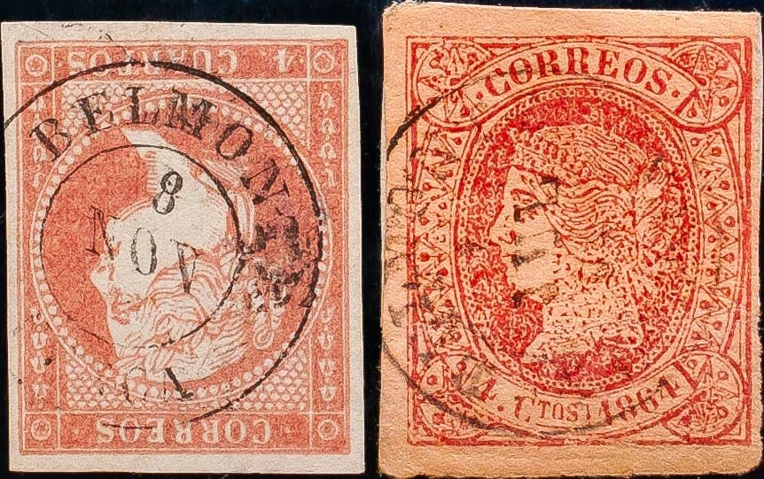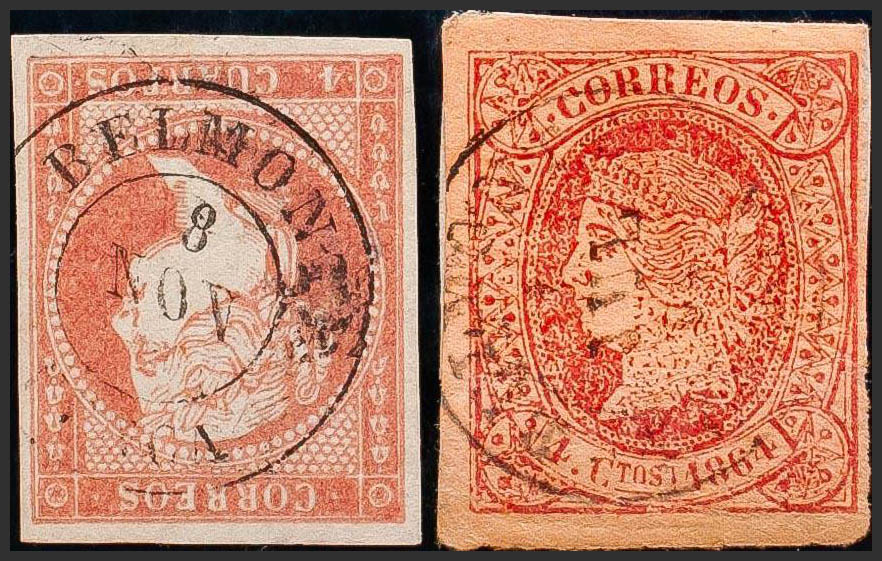 48, 64. (1855ca). Conjunto de dos sellos del 4 cuartos rojo y 4 cuartos rosa, inutilizados con matasello BELMONTE / CUENCA. MAGNIFICO.