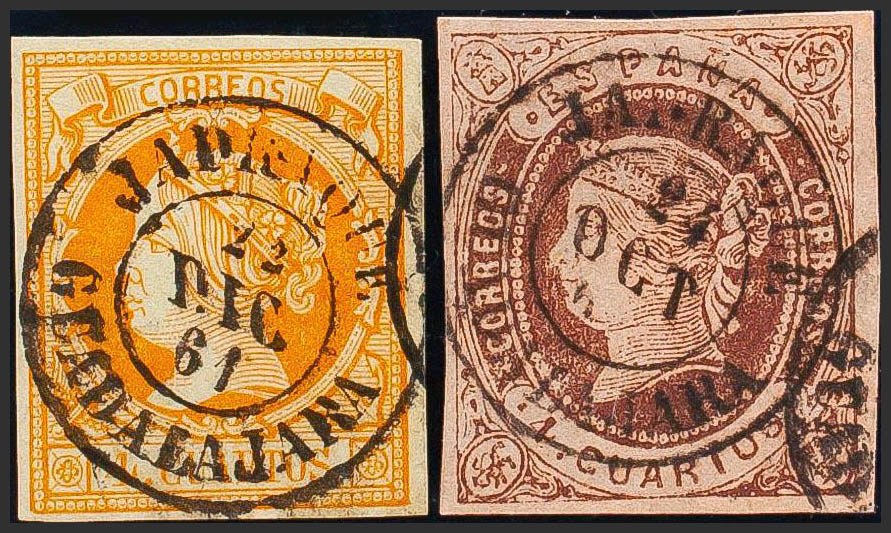 52, 58. (1860ca). Conjunto de dos sellos del 4 cuartos amarillo y 4 cuartos castaño, inutilizados con matasello JADRAQUE / GUADALAJARA. MAGNIFICO.