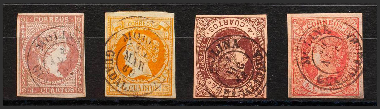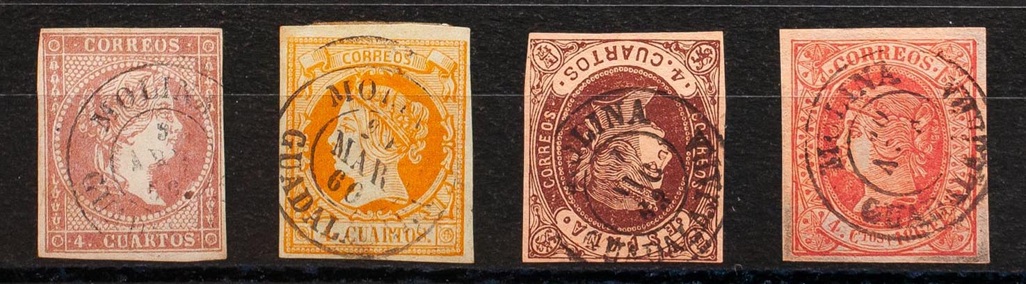 48, 52, 58, 64. (1855ca). Conjunto de cuatro sellos del 4 cuartos rojo, amarillo, castaño y rosa, inutilizados con matasello MOLINA / GUADALAJARA. MAGNIFICO.