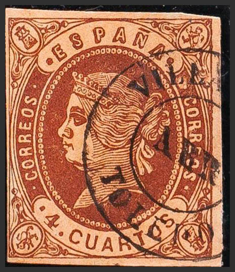 58. 1862. 4 cuartos castaño. Matasello VILLACAÑAS / TOLEDO. MAGNIFICO Y RARO.