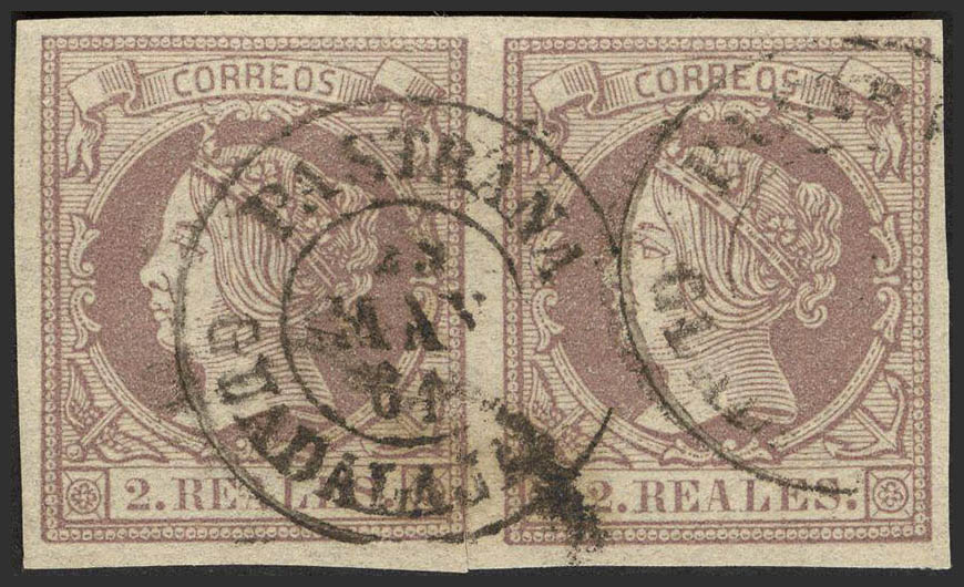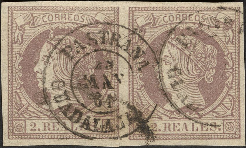 56(2). 1860. 2 reales lila, pareja. Matasello PASTRANA / GUADALAJARA. MAGNIFICO Y RARO.