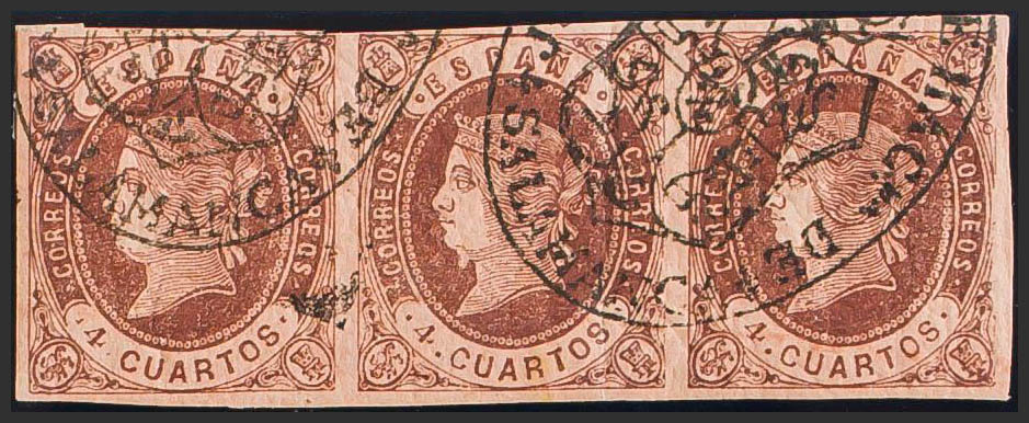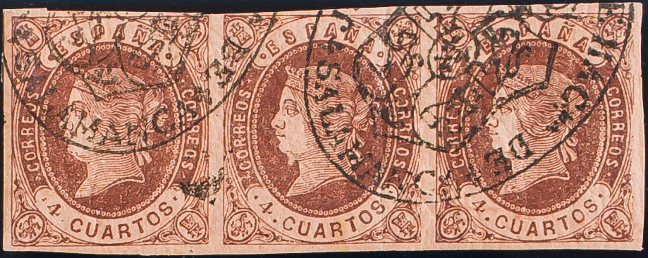 58(3). 1862. 4 cuartos castaño, tira de tres. Matasello JUZGADO DE 1ª INSTANCIA / SALAMANCA. MAGNIFICA E INUSUAL EN ESTA EMISION.