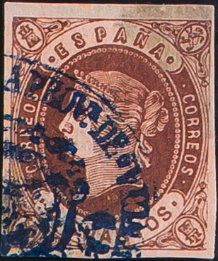 58. 1862. 4 cuartos castaño. Matasello HACIENDA PROVINCIAL DE PALENCIA, en azul. MAGNIFICO.