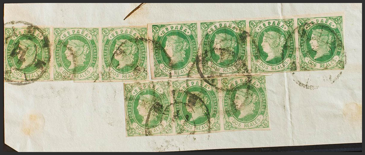 △ 62(10). 1862. 2 reales verde, dos tiras de tres y una tira de cuatro, sobre fragmento. Matasello R.CARRETA Nº14. MAGNIFICO E INUSUAL.