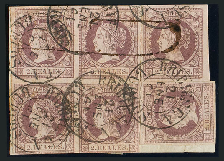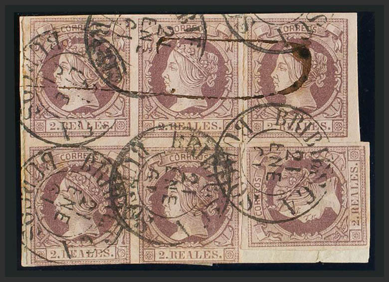 △ 56(6). 1860. 2 reales lila, bloque de cuatro y dos sellos, sobre fragmento. Matasello BRIBIESCA / BURGOS (Tipo I). MAGNIFICO.