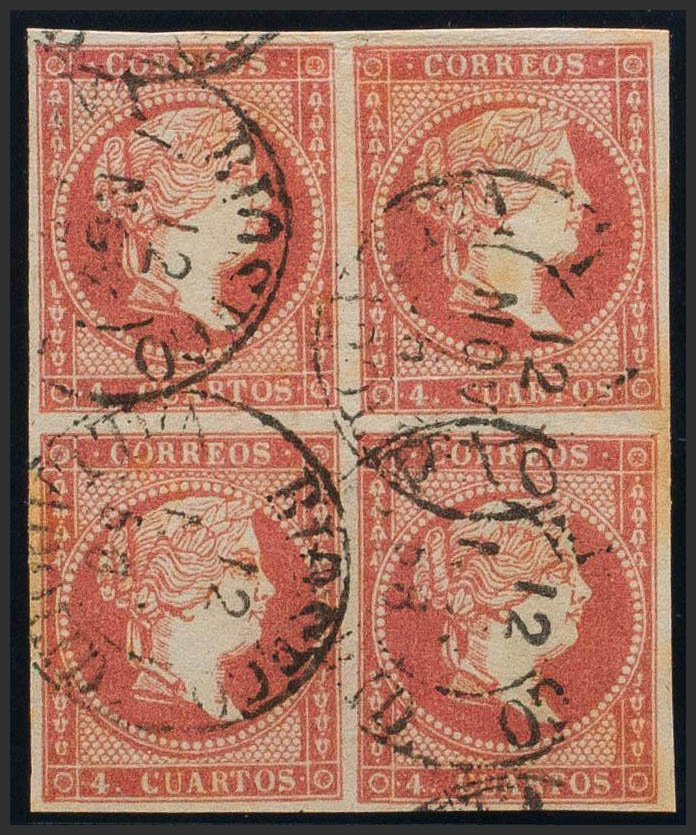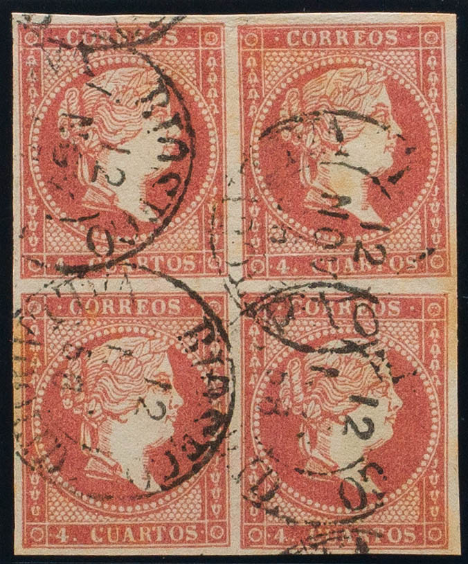 48(4). 1856. 4 cuartos rojo, bloque de cuatro. Matasello RIOSECO / VALLADOLID (Tipo I). MAGNIFICO.