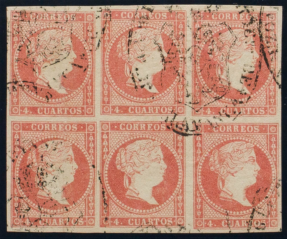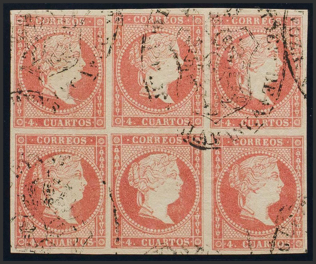 48(6). 1856. 4 cuartos rojo, bloque de seis. Matasello JUZGADO DE 1ª INSTª DE HACIENDA DE / SALAMANCA. MAGNIFICO Y RARO.