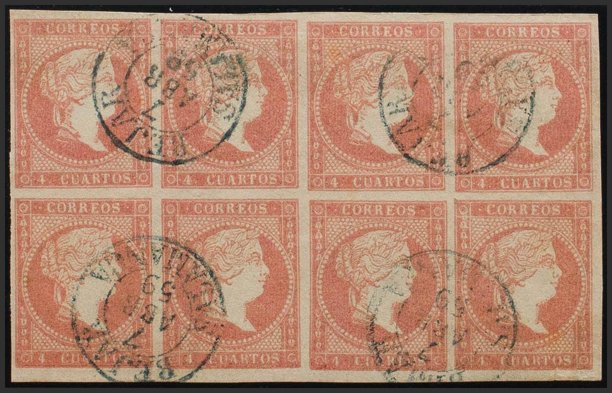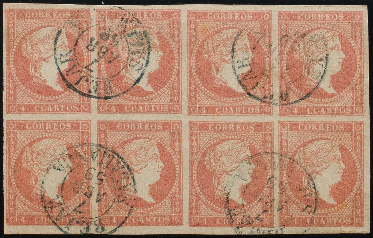48(8). 1856. 4 cuartos rojo, bloque de ocho. Matasello BEJAR / SALAMANCA (Tipo I), en azul. MAGNIFICO Y ESPECTACULAR.
