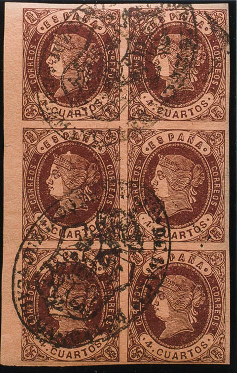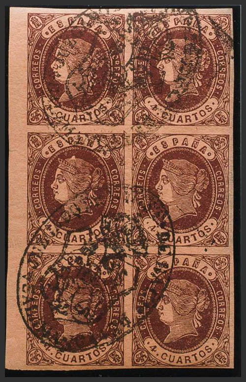 58(6). 1862. 4 cuartos castaño, bloque de seis, borde de hoja. Matasello JUZGADO DE 1ª YNSTA DE HCDA DE / SALAMANCA. MAGNIFICO.