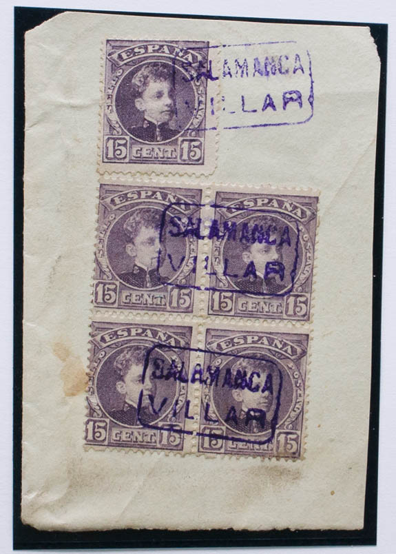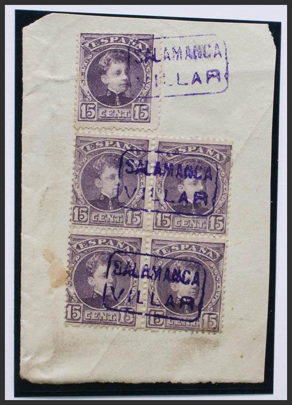 △ 245(5). 1901. 15 cts lila castaño, cinco sellos sobre fragmento. Matasello carterÃa SALAMANCA / VILLAR, en violeta. MAGNIFICO Y RARO.