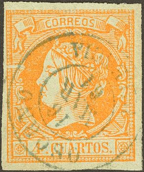 52. 1860. 4 cuartos amarillo. Matasello OSORNO / PALENCIA, en azul.