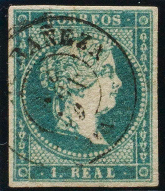 45. 1855. 1 real azul verdoso. Matasello LA BAÑEZA / LEON. MAGNIFICO Y RARO.
