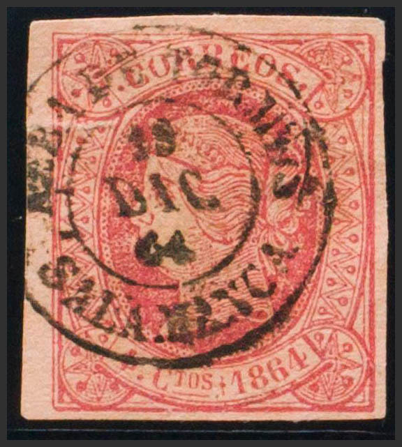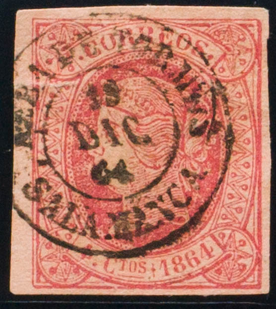 64. 1864. 4 cuartos rojo. Matasello ALBA DE TORMES / SALAMANCA. MAGNIFICO Y RARO.
