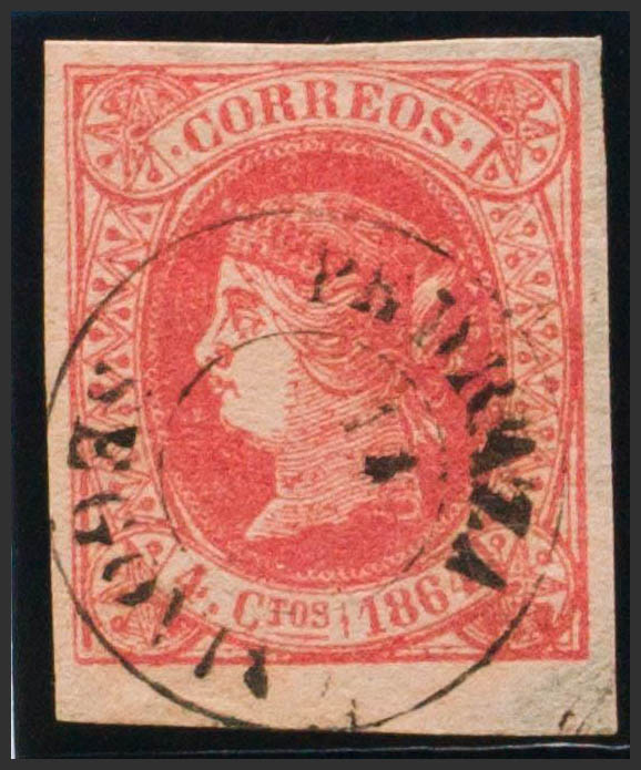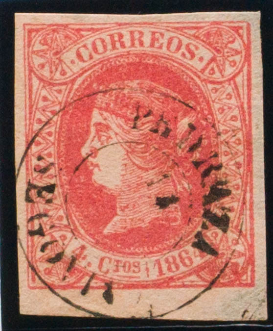 64. 1864. 4 cuartos rojo. Matasello PEDRAZA / SEGOVIA. MAGNIFICO.