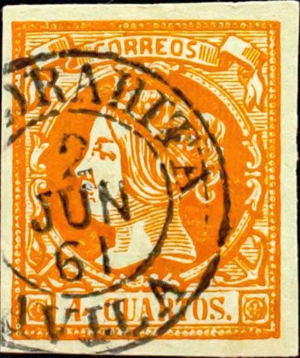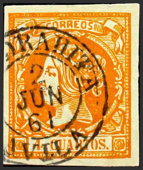 52. 1860. 4 cuartos naranja. Matasello PIEDRAHITA / AVILA (Tipo I). MAGNIFICO E INUSUAL.