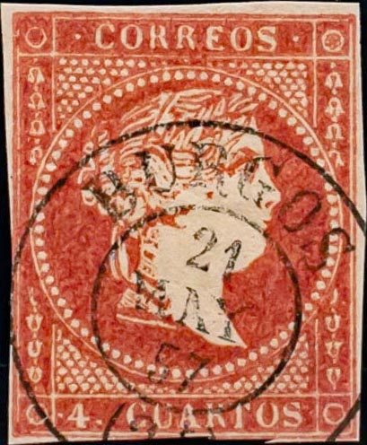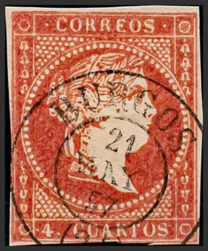 48. 1855. 4 cuartos rojo. Matasello BURGOS / (21). MAGNIFICO Y RARO.