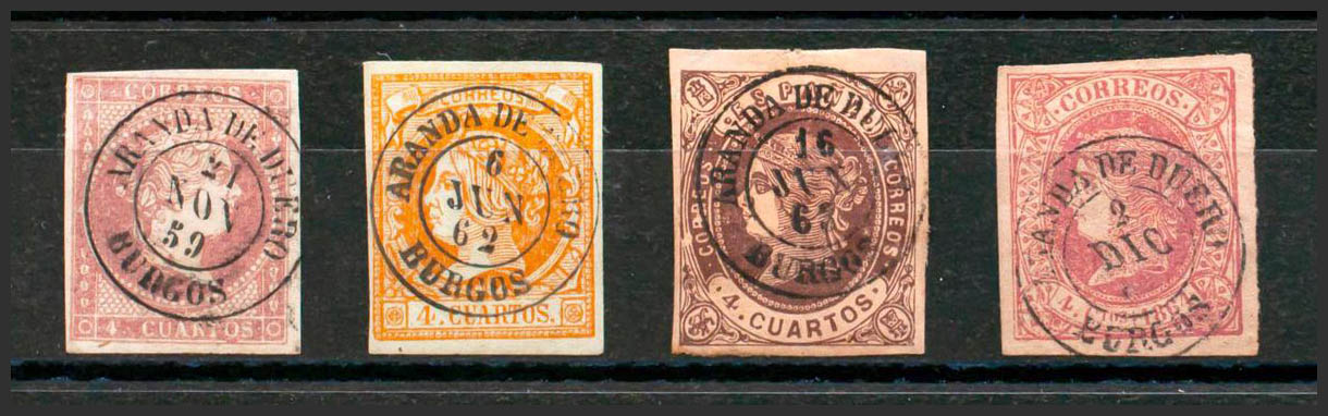 48, 52, 58, 64. (1855ca). Conjunto de cuatro sellos del 4 cuartos rojo, amarillo, castaño y rosa, inutilizados con el matasello ARANDA DE DUERO / BURGOS. MAGNIFICO.